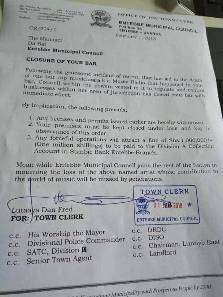 We understands that the decision was reached after the death of the celebrated musician was announced. "Following the gruesome incident that led to the death of one of our top musicians...that happened in your bar, council within the powers vested in it to regulate and control businesses within her area has closed your bar with immediate action," the letter partly read.
